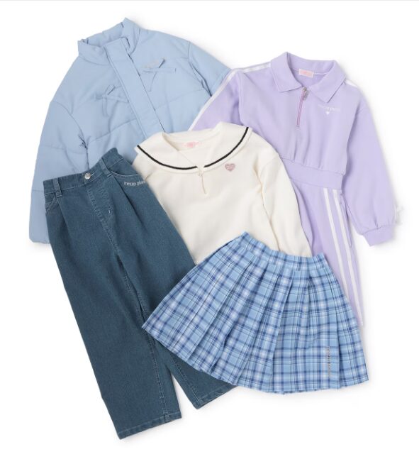 中身は、中わたブルゾン、セーラートレーナー、チェックプリーツスカパン、デニムロングパンツ、ワンピースの5点セット。